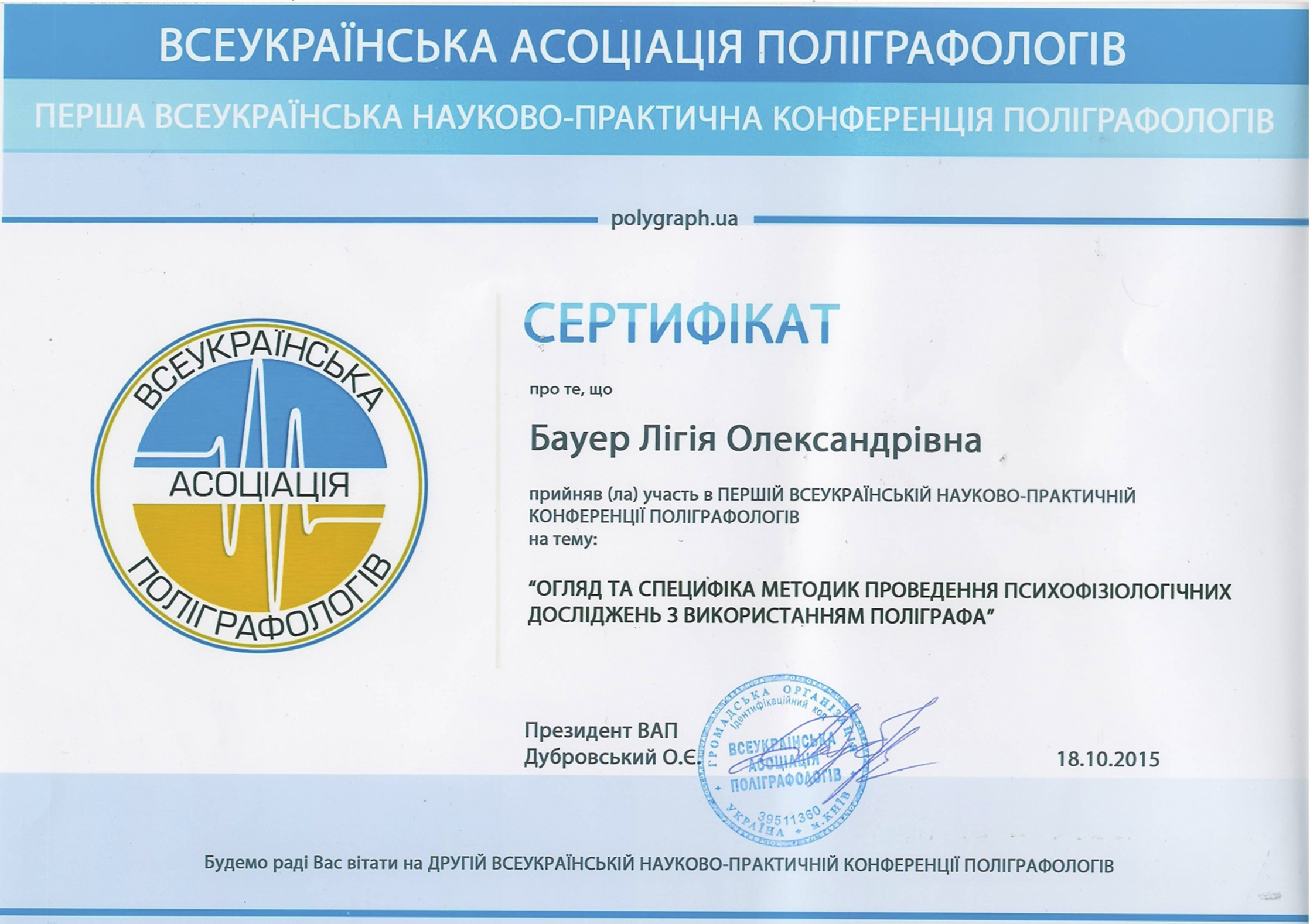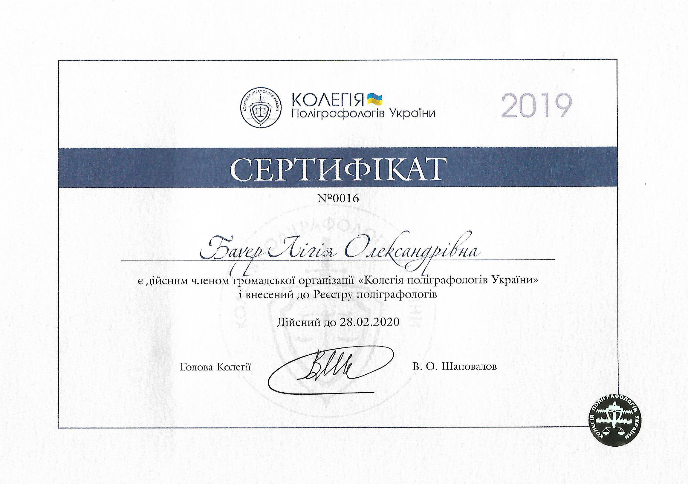 Володіє всіма методиками проведення перевірок, є членом ГО «Колегія поліграфологів України», членом Асоціації поліграфологів Великобританії. Детальніше в дипломах.
