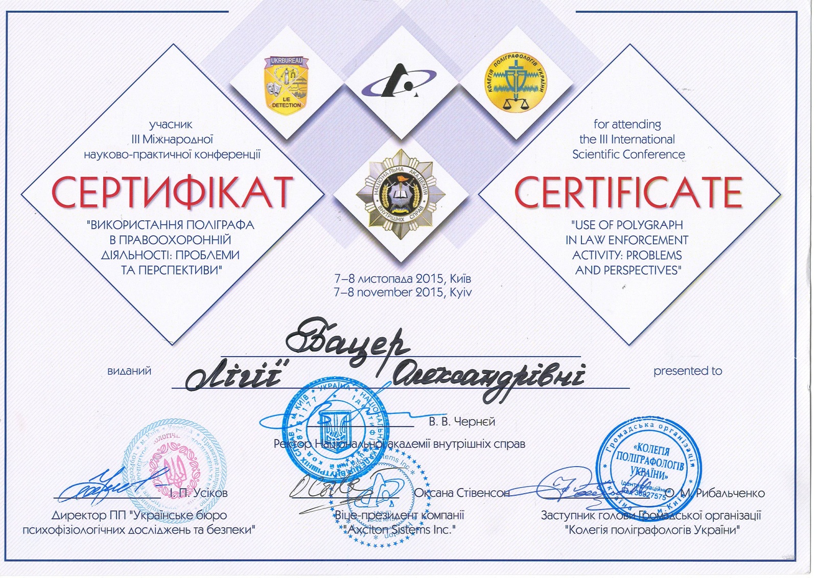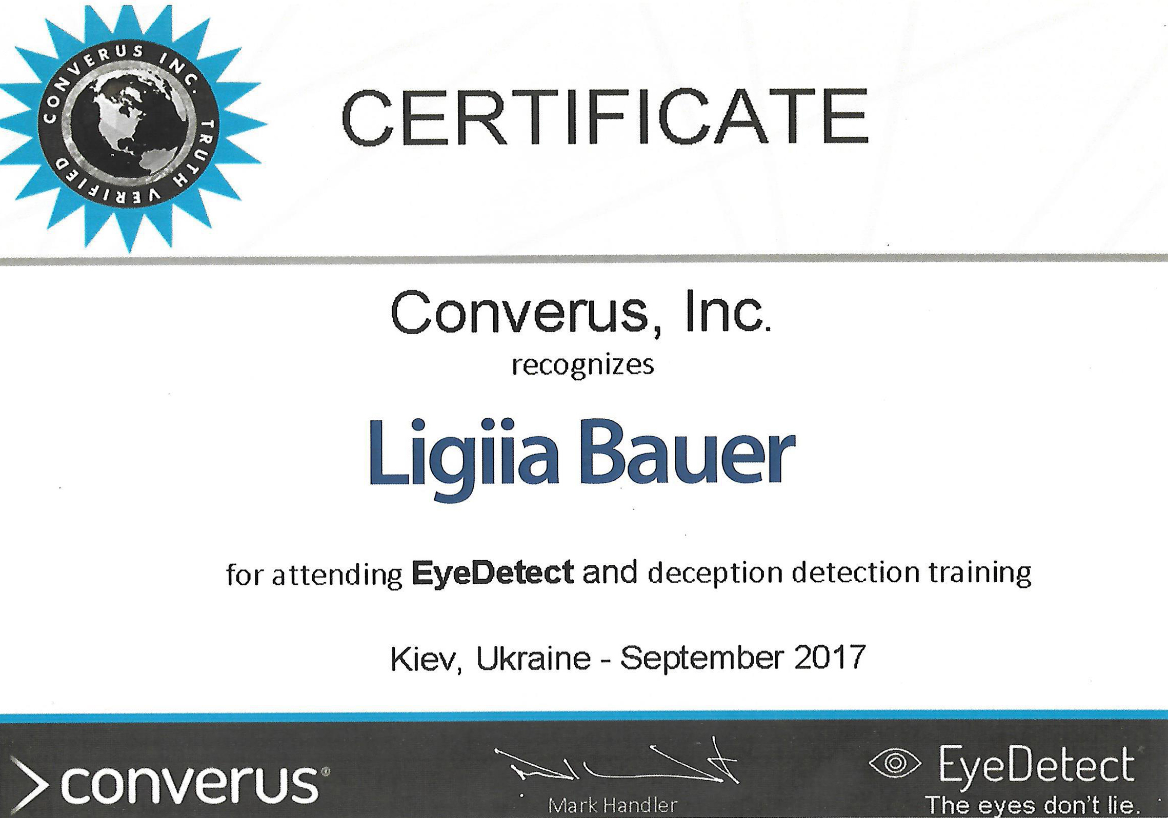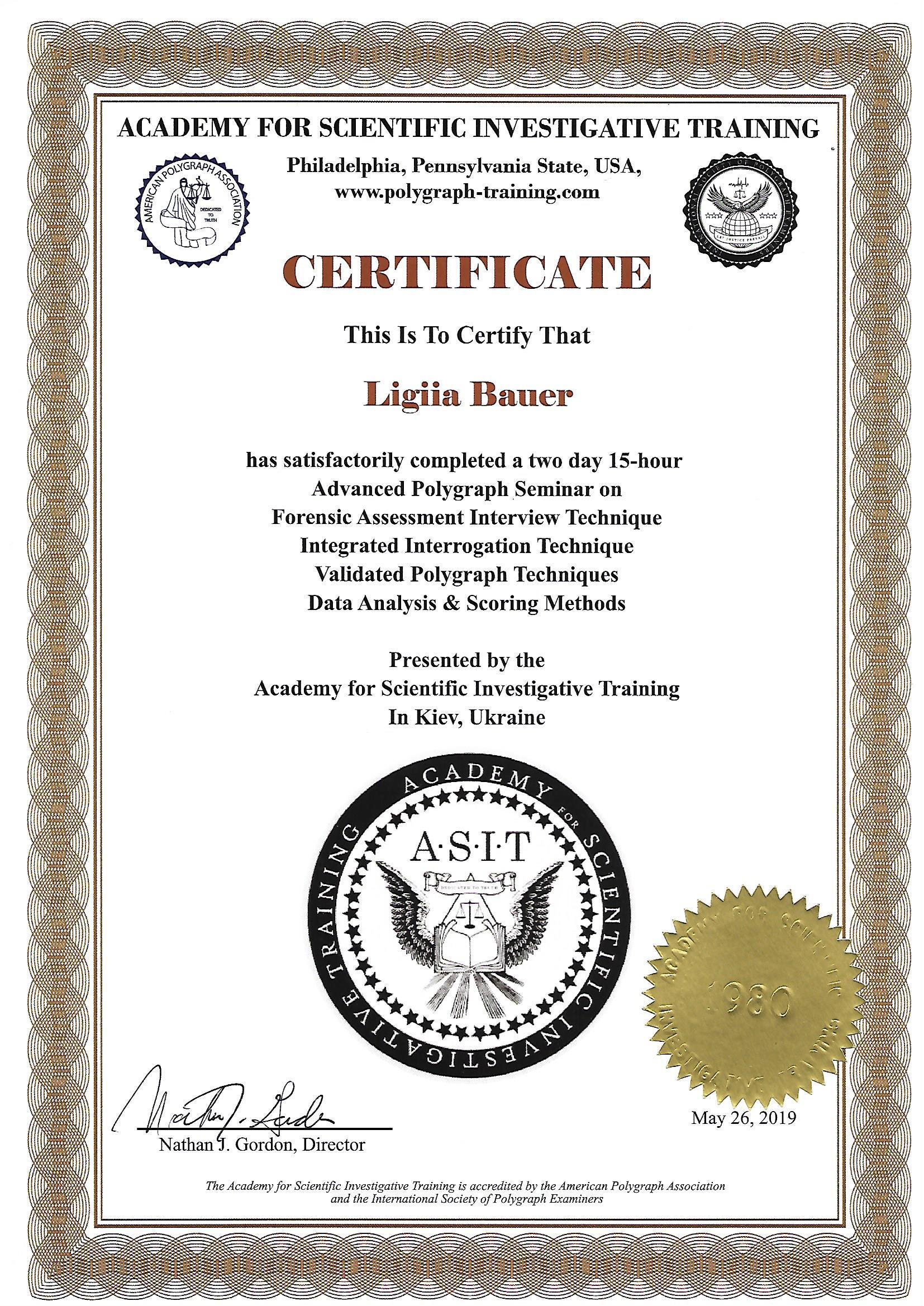 • Програма підвищення кваліфікації щодо скорочення кількості непереконливих результатів, постановці тестових питань, огляду поліграфних тестувань в рамках кримінального провадження та аналітичної теорії поліграфа, Київ, Україна - грудень 2018 р.