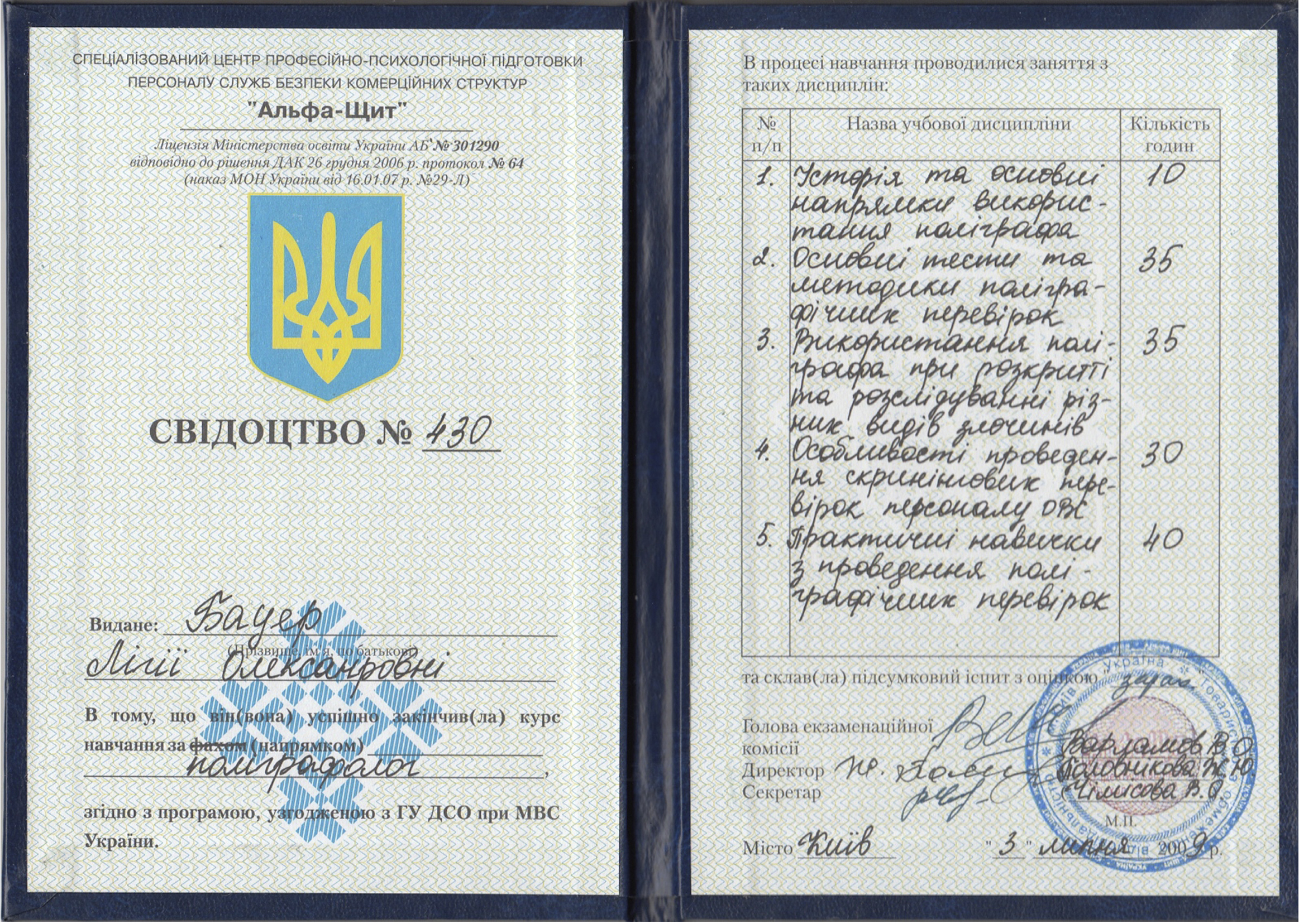 Володіє всіма методиками проведення перевірок, є членом ГО «Колегія поліграфологів України», членом Асоціації поліграфологів Великобританії. Детальніше в дипломах.