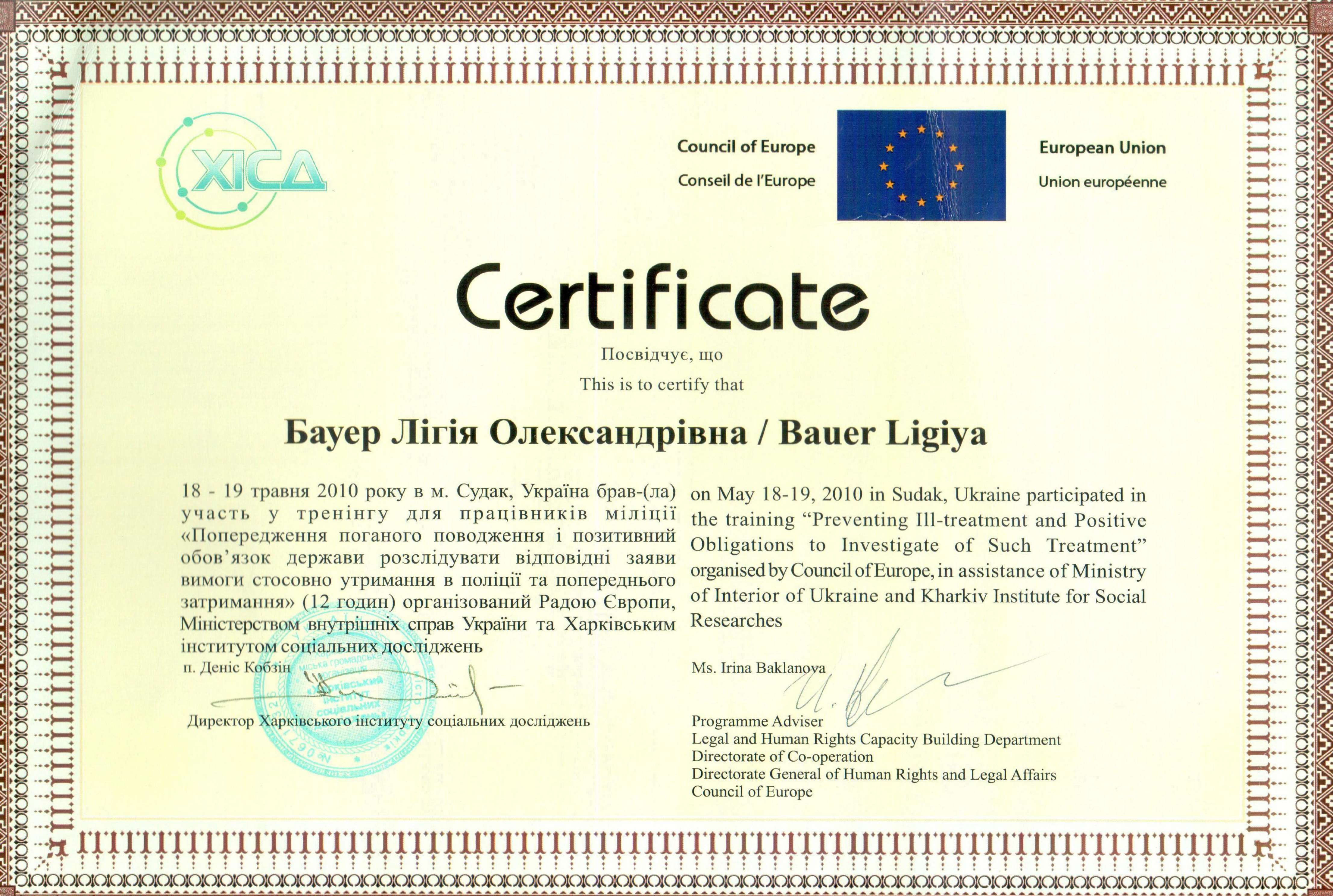 • Міжнародний тренінг для співробітників міліції «Попередження жорстокого поводження і позитивні зобов'язання з розслідування випадків такого звернення» (Судак). Рік випуску