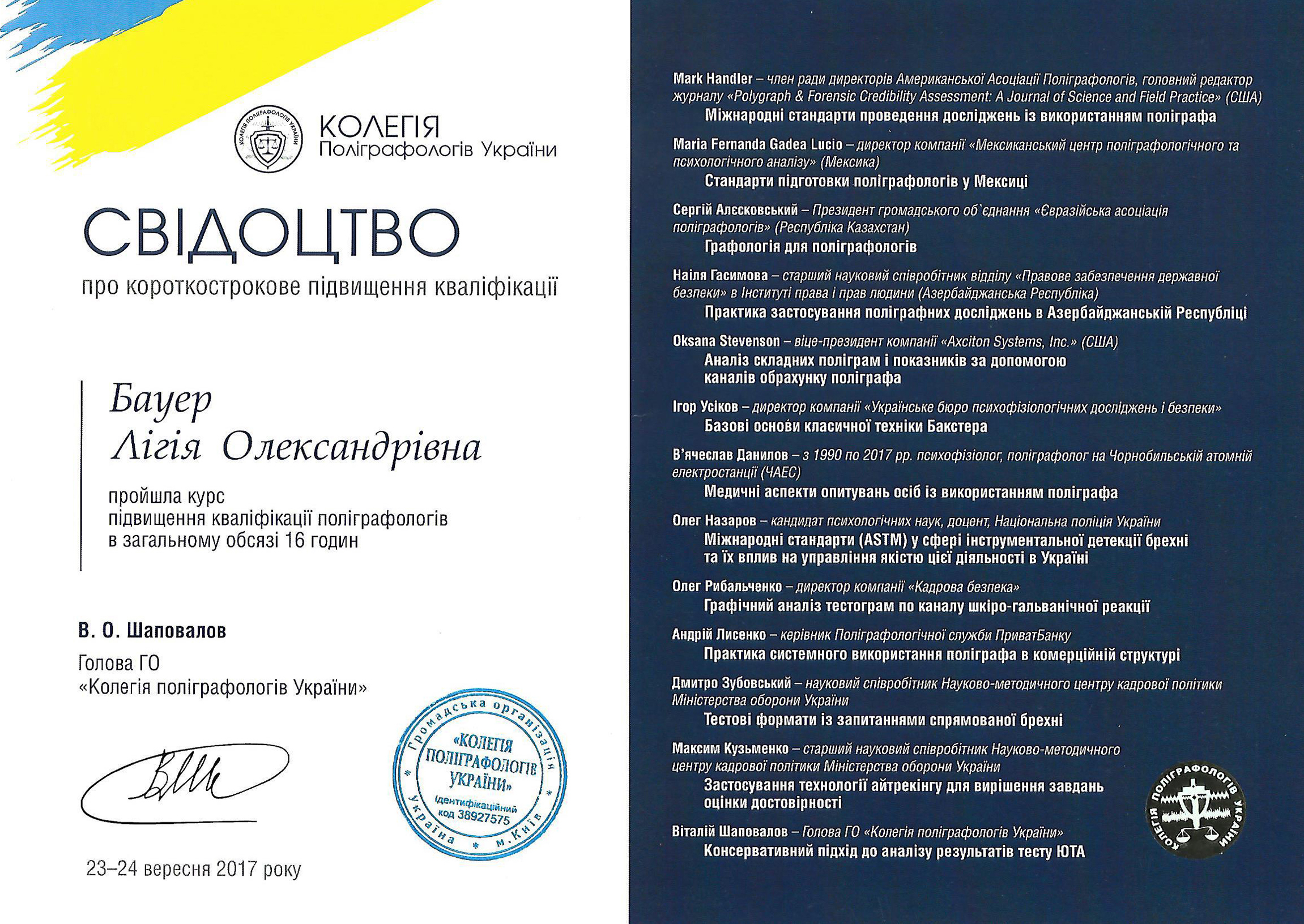 • одноденний 8-годинний курс підвищення кваліфікації для поліграфологів, Київ, Україна - грудень 2019 р.