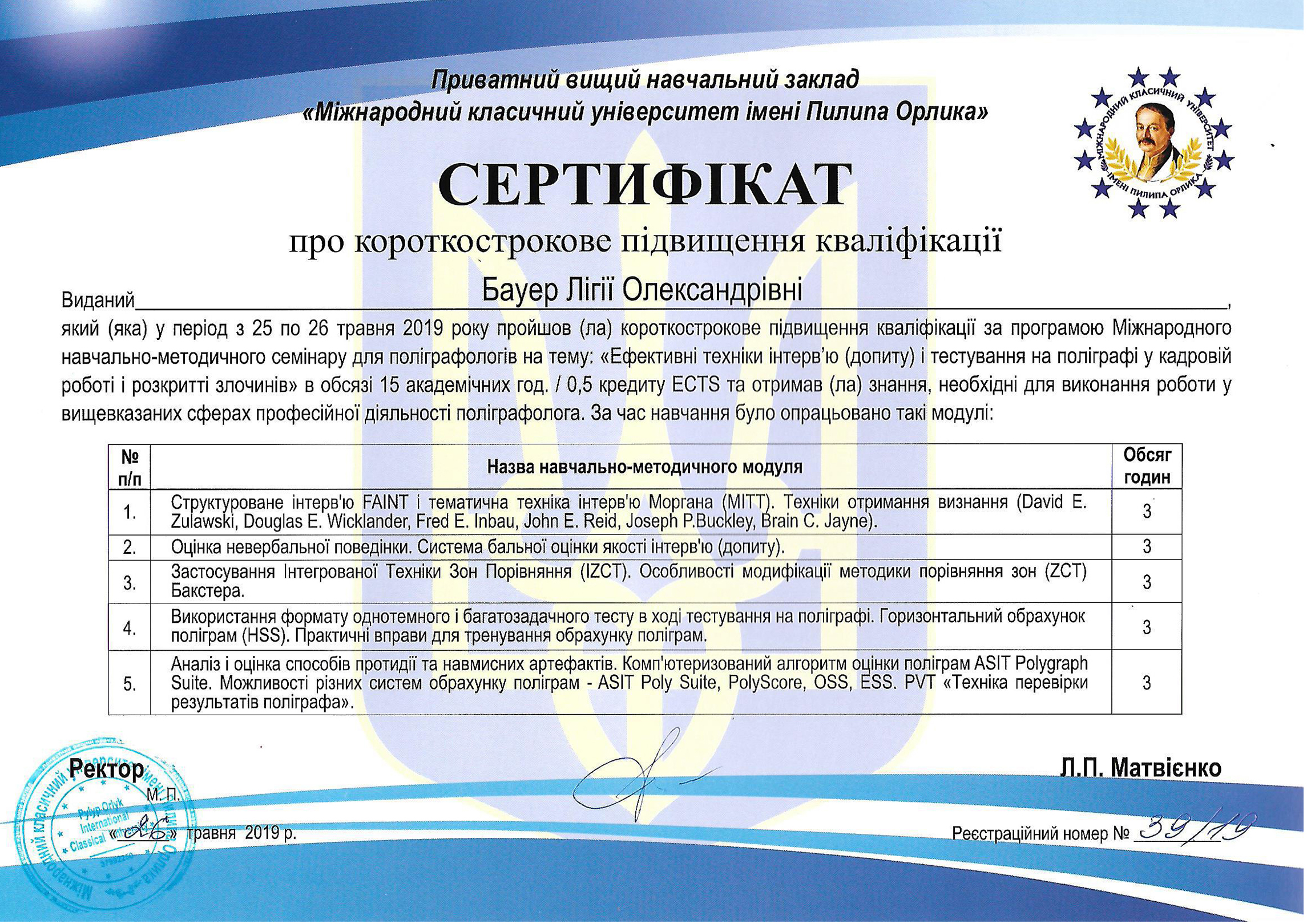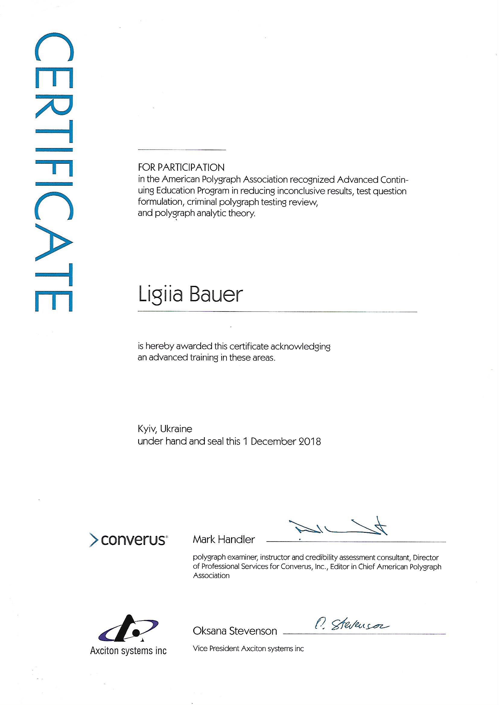 • Програма підвищення кваліфікації щодо скорочення кількості непереконливих результатів, постановці тестових питань, огляду поліграфних тестувань в рамках кримінального провадження та аналітичної теорії поліграфа, Київ, Україна - грудень 2018 р.